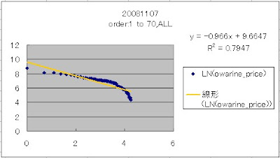 :両対数グラフをExcelで作成する(y軸を終値にする。x軸を順位(降順)とする)。